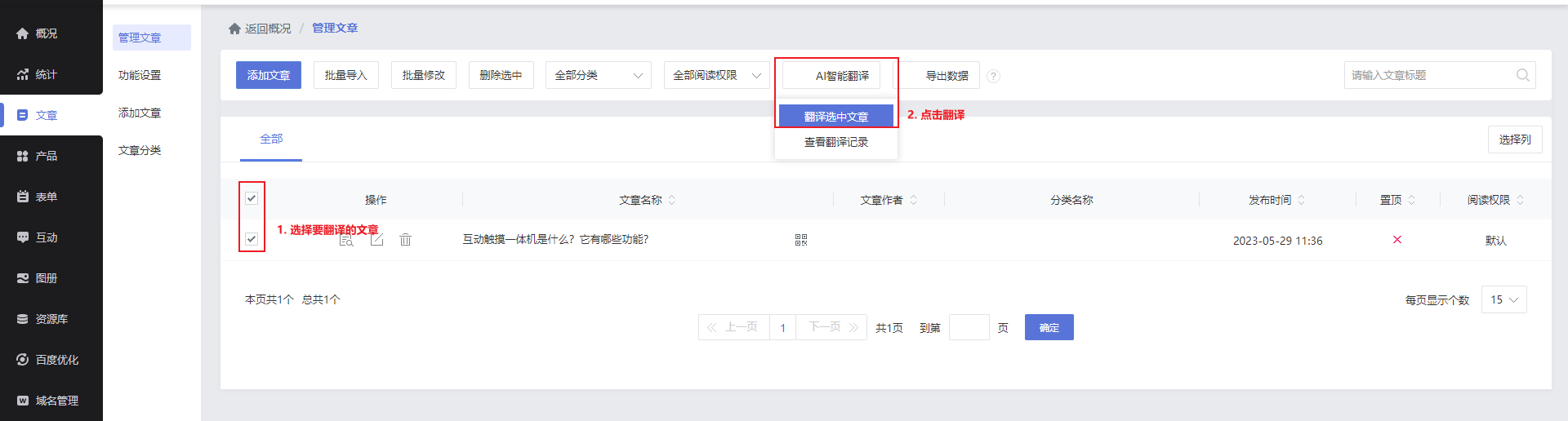 勾选需要进行翻译的文章,点击AI智能翻译。