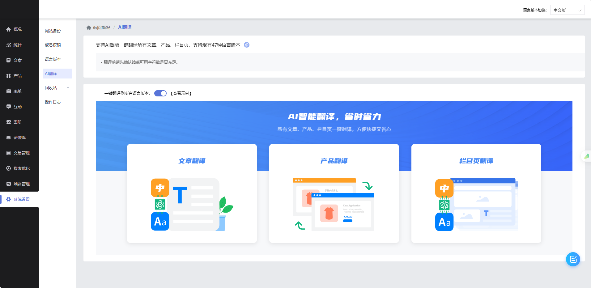 (一)文章AI智能翻译(二)产品AI智能翻译(三)栏目智能翻译(四)一键翻译