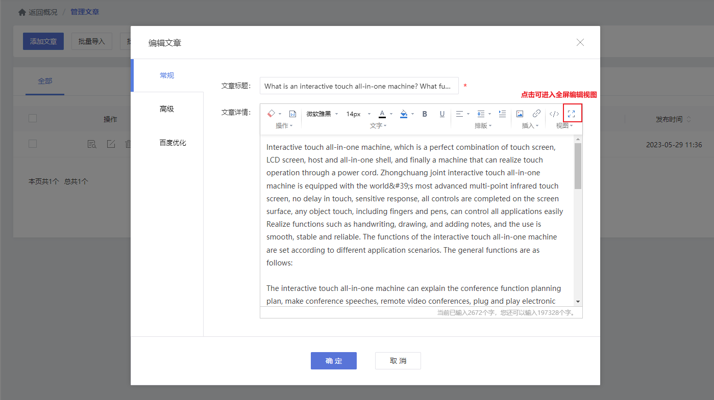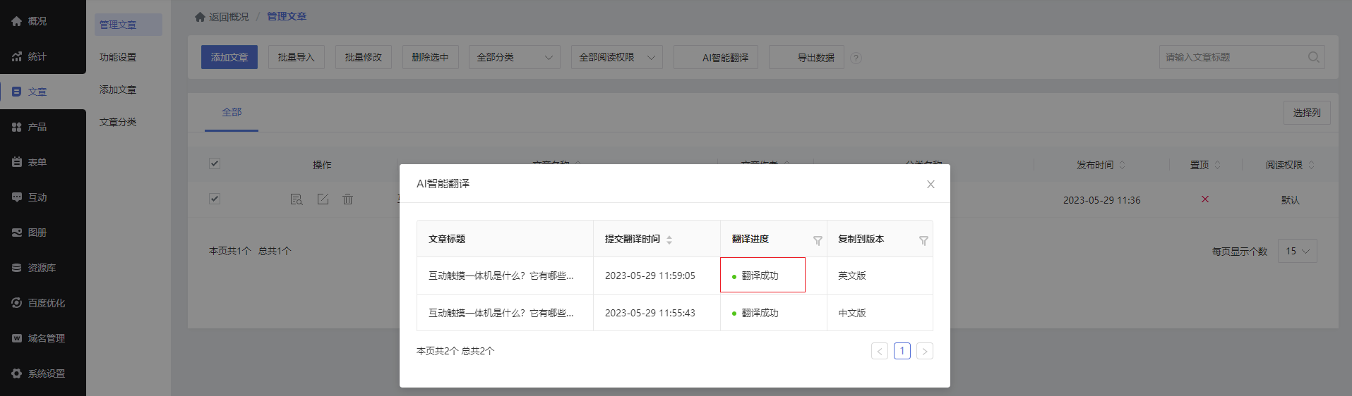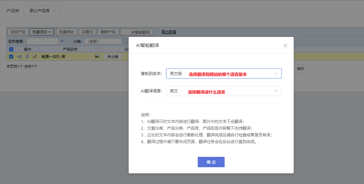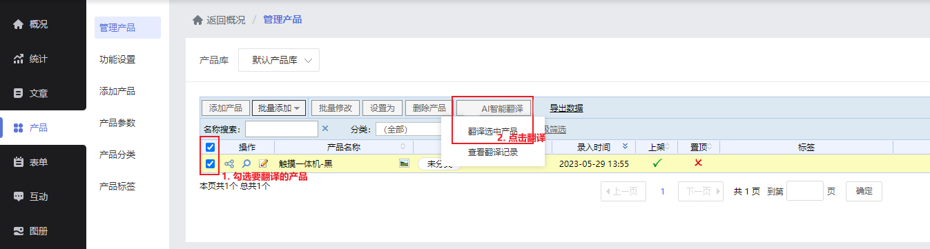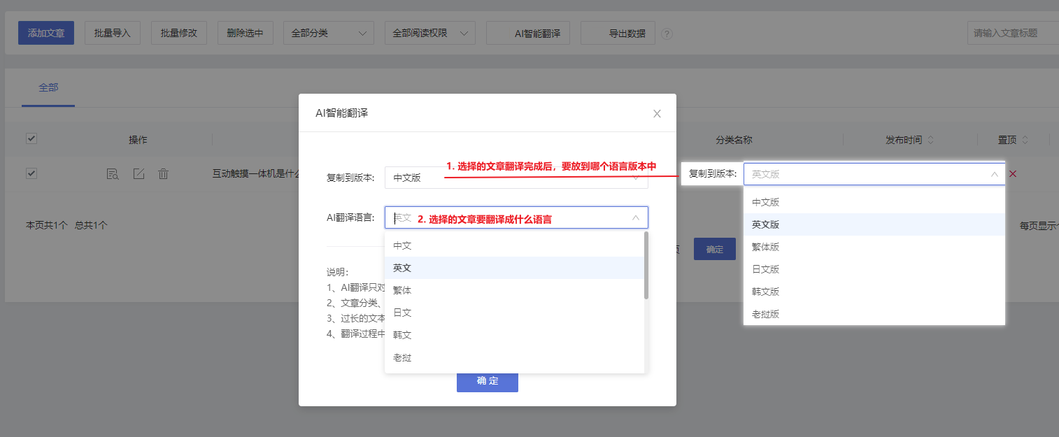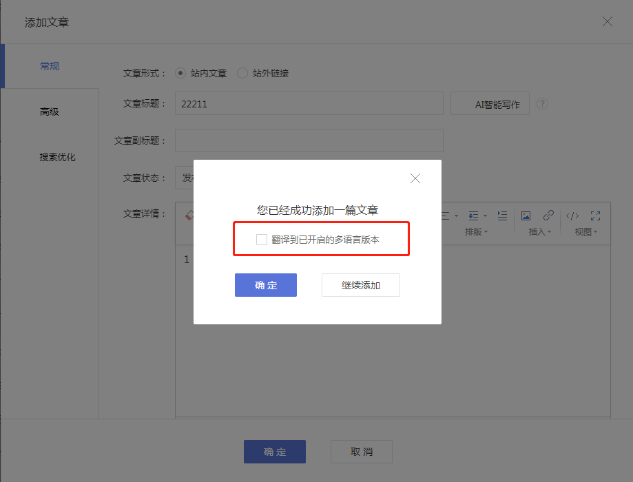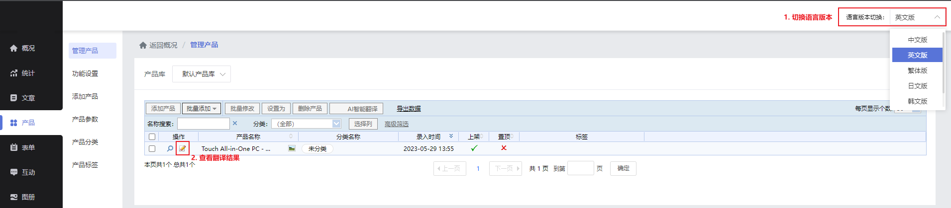 开启功能后,添加文章\产品时,文章/产品管理页面,原有AI翻译入口都支持将文章/产品一键翻译到所有已开启的语言版本。