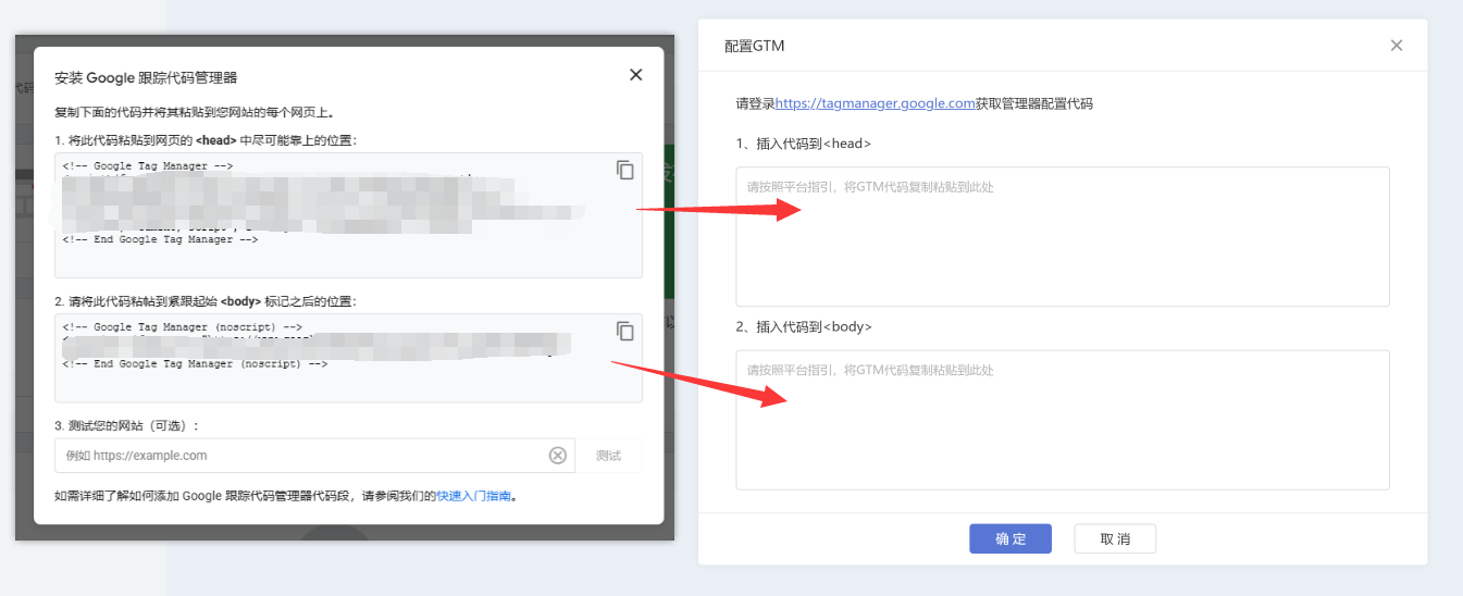 在弹窗中,复制GTM平台提供的代码信息到建站中: