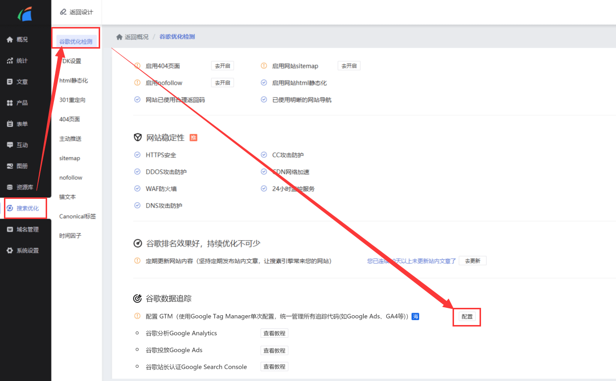 打开建站管理后台,在搜索优化-谷歌优化检测中,点击配置GTM。