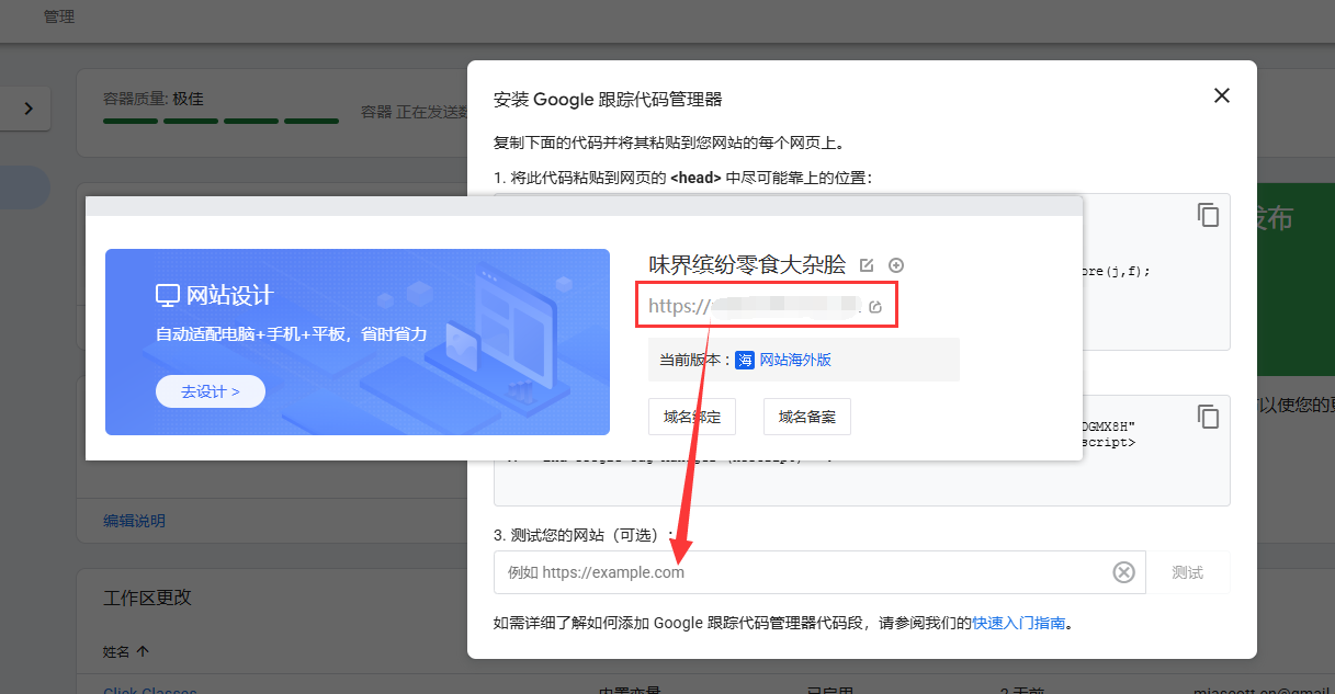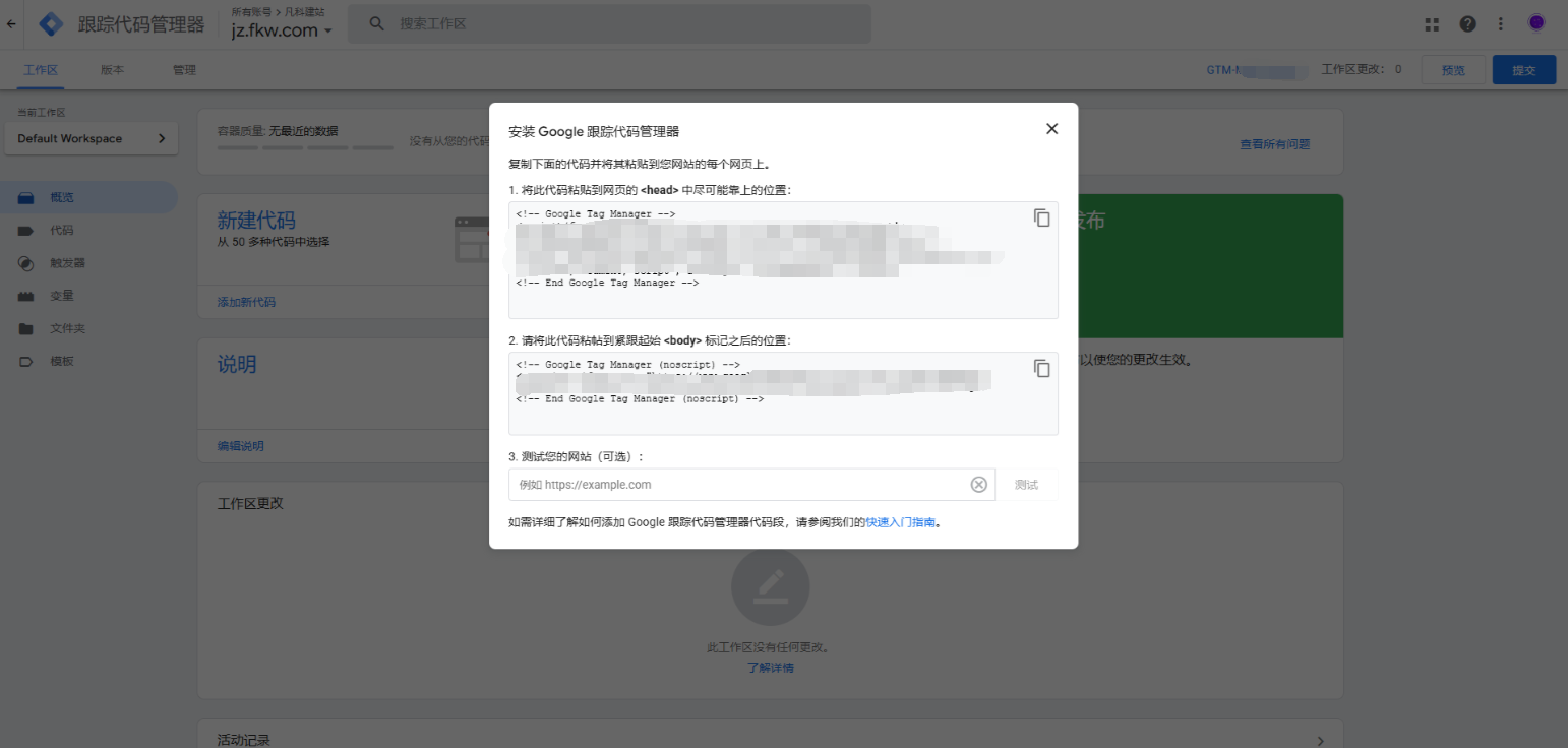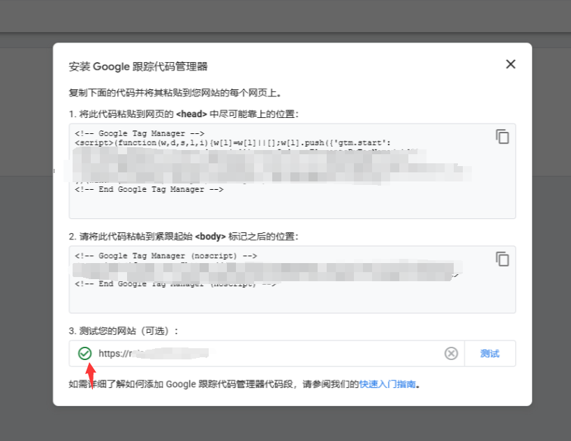 保存成功后,获取您的网站地址,填入GTM弹窗中,进行安装检测。