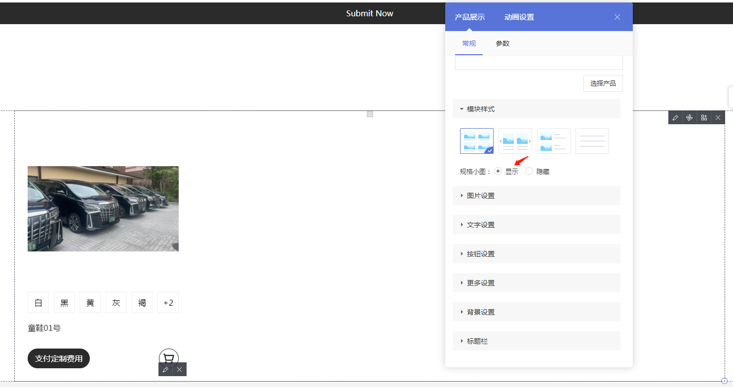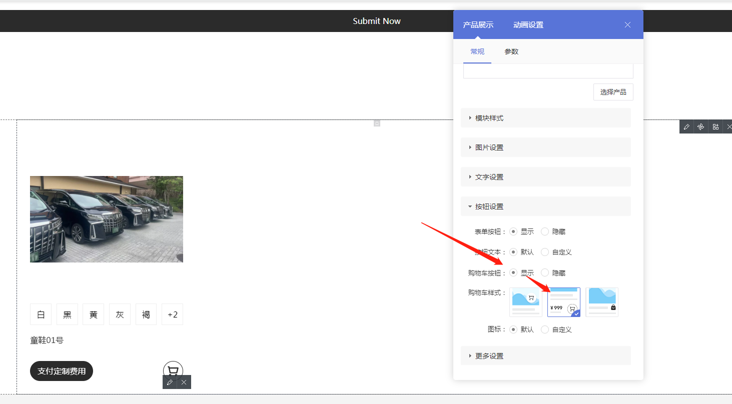 2. 点开按钮设置,选择显示购物车按钮并选择合适的样式