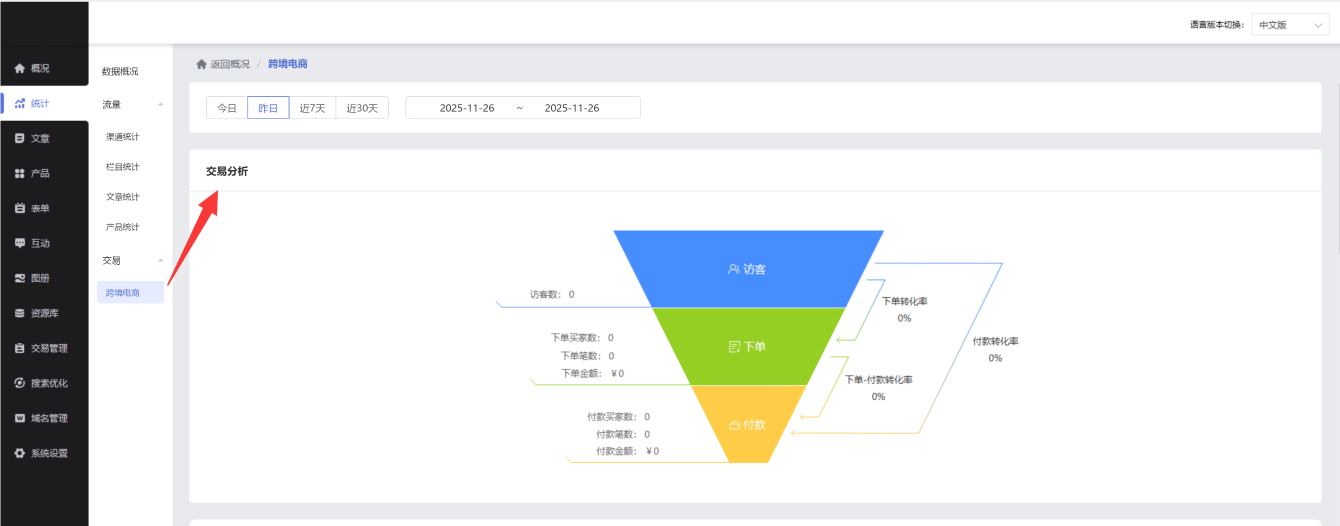 新开启跨境电商之后,后台新增交易漏斗,数据范围仅跨境电商产品。