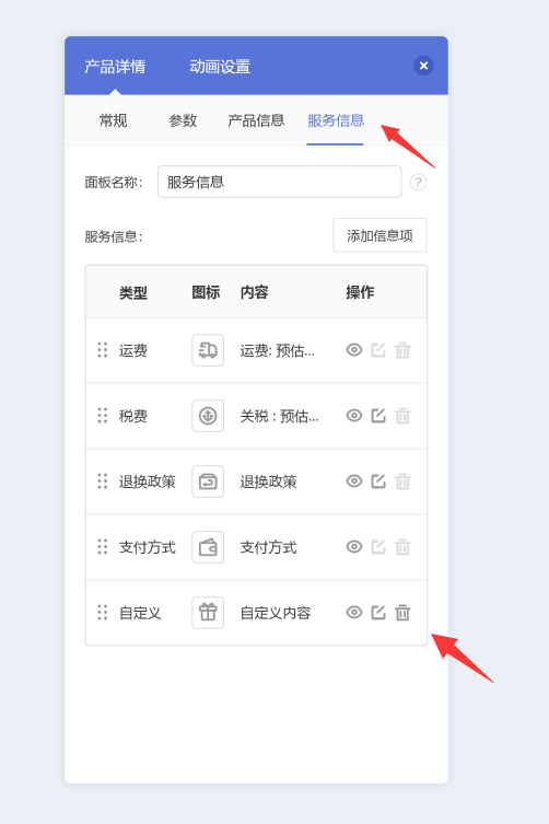 产品详情页面点击编辑产品详情模块,在“服务信息”的菜单中编辑展示服务