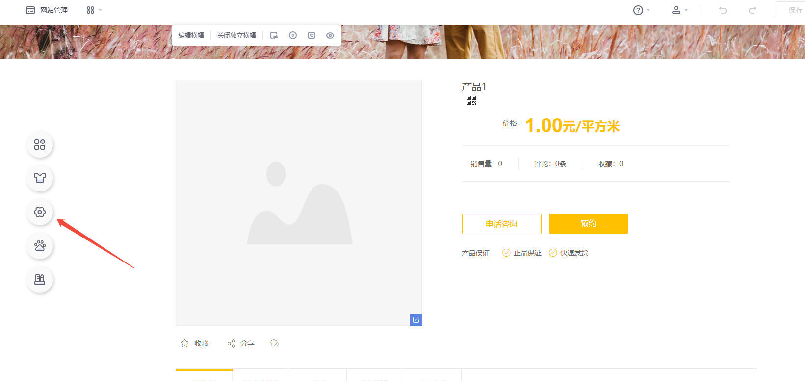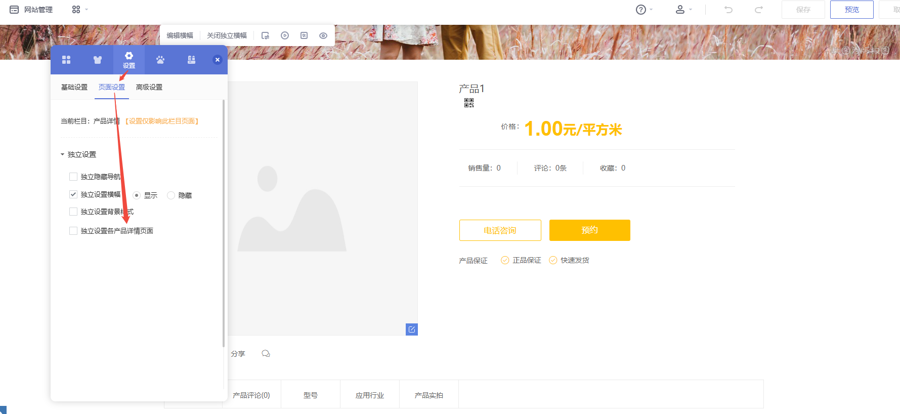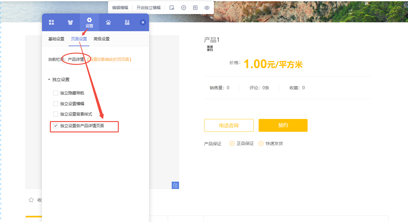 以产品为例,在后台点击单个产品页面设计按钮,在设计页面点击左侧设置按钮,最后在页面设置-独立设置-独立设置各产品详情页面勾选启用,保存并刷新页面后设计就仅在当前产品的详情页面生效了。