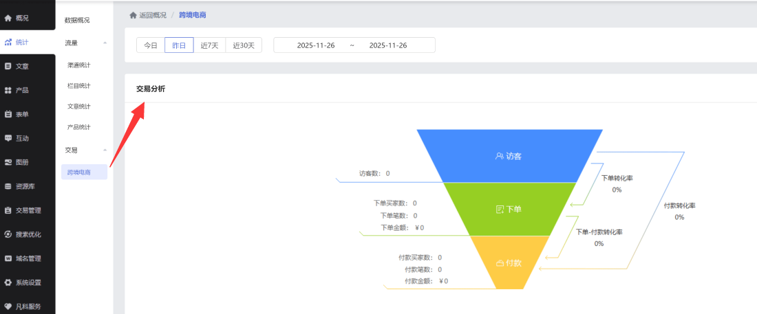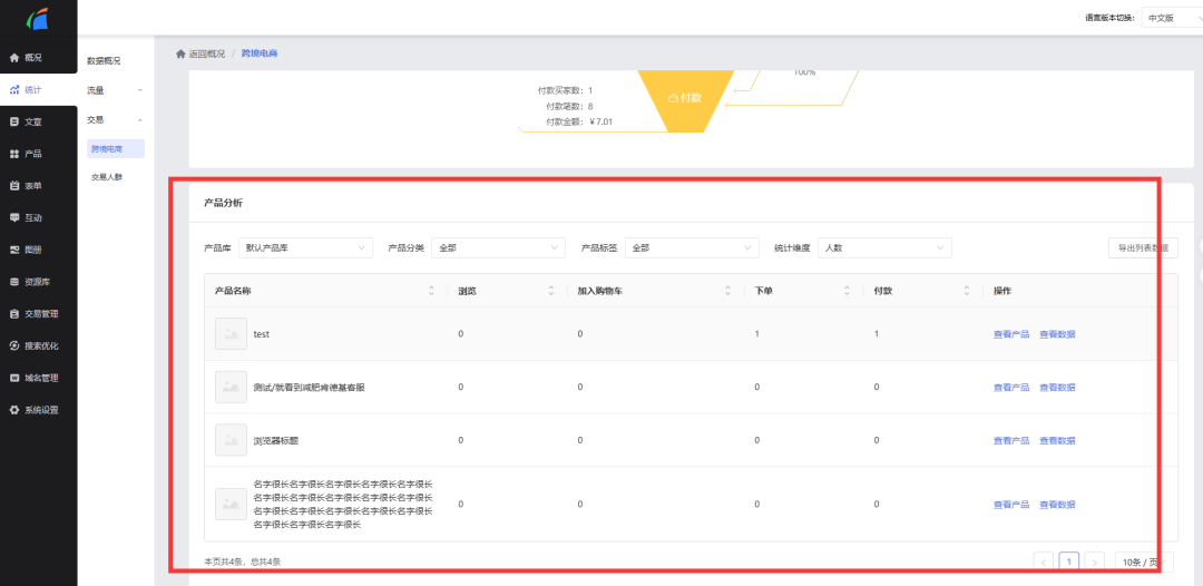 满足贸易商家的日常数据运营需求(需开启跨境电商功能后生效)。新增“产品分析”与“交易人群分析”维度的交易数据,助力商家更精准地掌握运营情况。